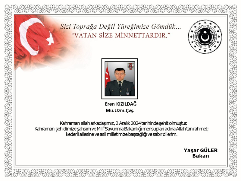 Milli Savunma Bakanlığı'ndan yapılan açıklamada, "Pençe-Kilit operasyonu bölgesinde, 16 Kasım 2024 tarihinde bölücü terör örgütü mensupları tarafından açılan taciz ateşi sonucu ağır yaralanan ve Gülhane Eğitim ve Araştırma Hastanesi'nde tedavisine devam edilen kahraman silah arkadaşımız Mu. Uzm. Çvş. Eren Kızıldağ, yapılan tüm müdahalelere rağmen kurtarılamayarak 2 Aralık 2024 tarihinde şehit olmuştur. Bizleri derin bir acı ve üzüntüye boğan bu olayda hayatını kaybeden aziz şehidimize Allah'tan rahmet, kederli ailesine, Türk Silahlı Kuvvetleri ile asil milletimize başsağlığı ve sabır dileriz" ifadeleri kullanıldı.