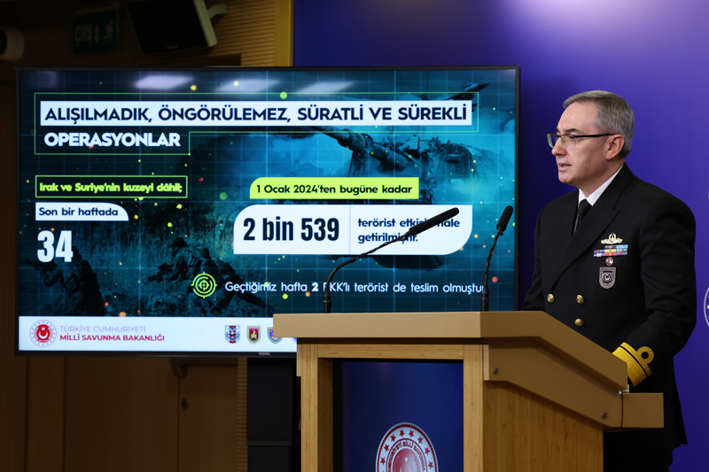 Terörle mücadele operasyonları hakkında bilgi veren Aktürk, "Türk Silahlı Kuvvetlerimizin (TSK) sahanın gerekliliğine uygun, alışılmadık, öngörülemez, süratli ve sürekli icra esaslarında gerçekleştirdiği kararlı operasyonlarla Irak ve Suriye'nin kuzeyi dahil, 34'ü son bir haftada olmak üzere 1 Ocak'tan bugüne kadar 2 bin 539 terörist etkisiz hale getirilmiştir." diye konuştu.