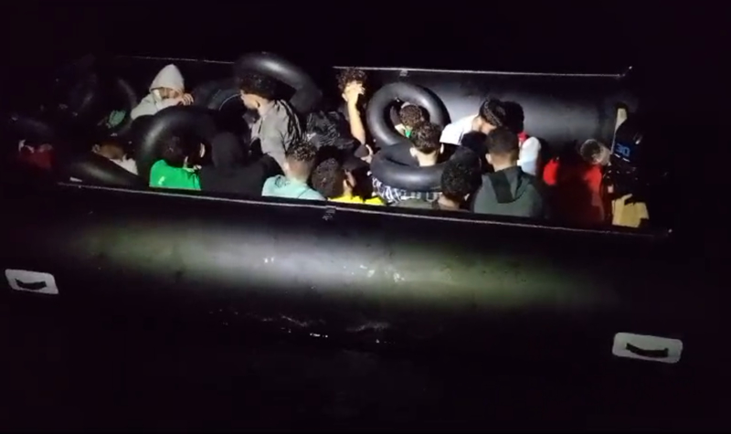 Milas ilçesi açıklarında Sahil Güvenlik uçağı tarafından lastik botta bir grup düzensiz göçmen olduğunun tespit edilmesi üzerine görevlendirilen sahil güvenlik botu, hareket halindeki botu durdurarak içindeki 2'si çocuk 19 düzensiz göçmeni yakaladı.