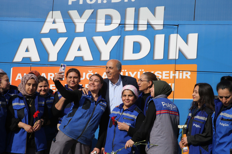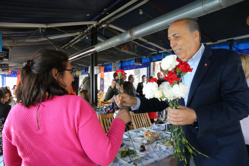 Kadınlarla bir süre sohbet eden Ayaydın, işçilere karanfil verdi.