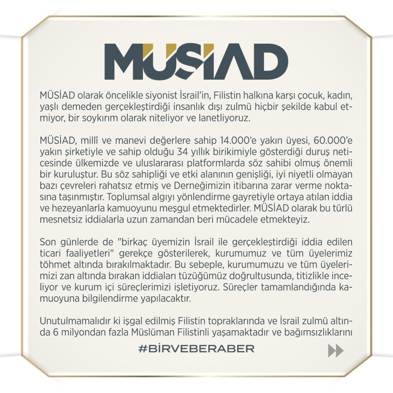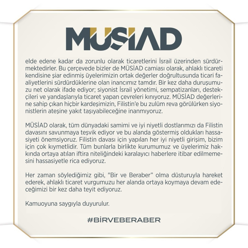 Unutulmamalıdır ki işgal edilmiş Filistin topraklarında ve İsrail zulmü altında 6 milyondan fazla Müslüman Filistinli yaşamaktadır ve bağımsızlıklarını elde edene kadar da zorunlu olarak ticaretlerini İsrail üzerinden sürdürmektedirler. Bu çerçevede bizler de MÜSİAD camiası olarak, ahlaklı ticareti kendisine şiar edinmiş üyelerimizin ortak değerler doğrultusunda ticari faaliyetlerini sürdürdüklerine olan inancımız tamdır. Bir kez daha duruşumuzu net olarak ifade ediyor; siyonist İsrail yönetimi, sempatizanları, destekçileri ve yandaşlarıyla ticaret yapan çevreleri kınıyoruz. MÜSİAD değerlerine sahip çıkan hiçbir kardeşimizin, Filistin'e bu zulüm reva görülürken siyonistlerin ateşine yakıt taşıyabileceğine inanmıyoruz.