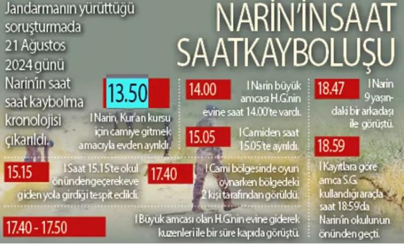 Akşam Gazetesi'nin haberine göre, S.G.'nin arama faaliyetlerinde hep ön planda olma algısı yaratmaya çalışması da jandarmanın şüphesini çekti. S.G.'nin Narin'in kaybolduğu saat diliminde WhatsApp görüşmelerini ve cep telefonu görüşme kayıtlarını sildiği tespit edildi. S.G., tüm sorulara "hatırlamıyorum " şeklinde yanıt verdi.