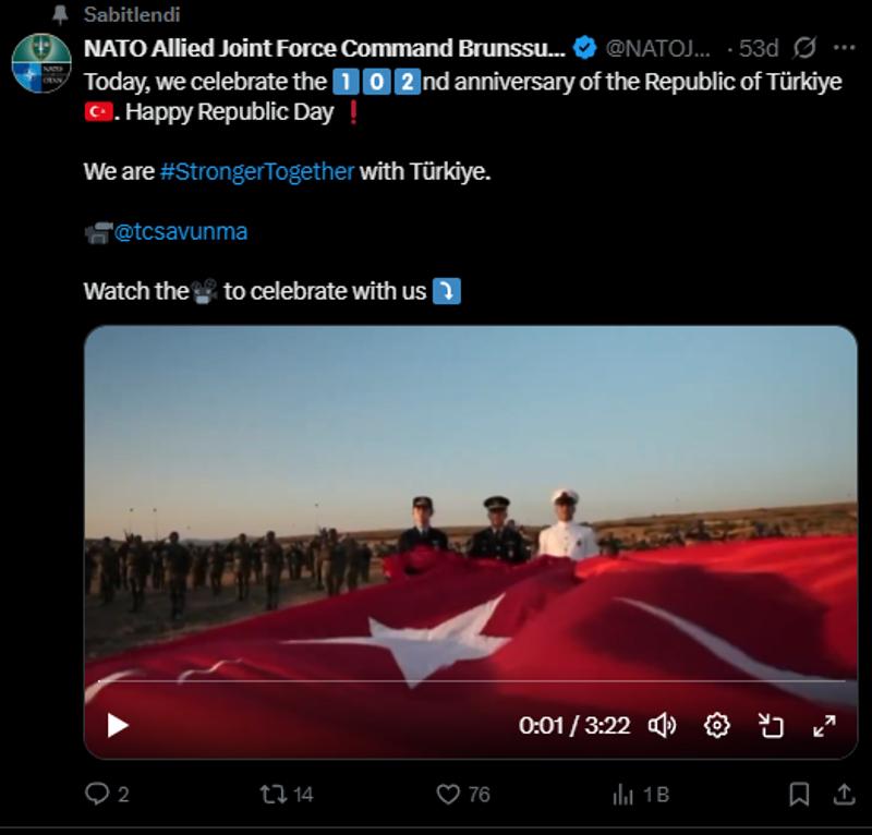 Türkiye Cumhuriyeti'nin kuruluşunun 102. yıl dönümü vesilesiyle NATO, Türkiye'ye Cumhuriyet Bayramı dolayısıyla özel bir kutlama mesajı gönderdi.