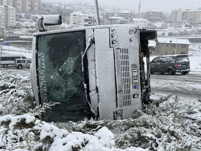 Abdullah Ağmanalmaz idaresindeki 50 EC 110 plakalı minibüs, Yavuz Sultan Selim Mahallesi Kayaşehir yolunda, kar yağışının ardından kayganlaşan yolda refüje çarparak devrildi.