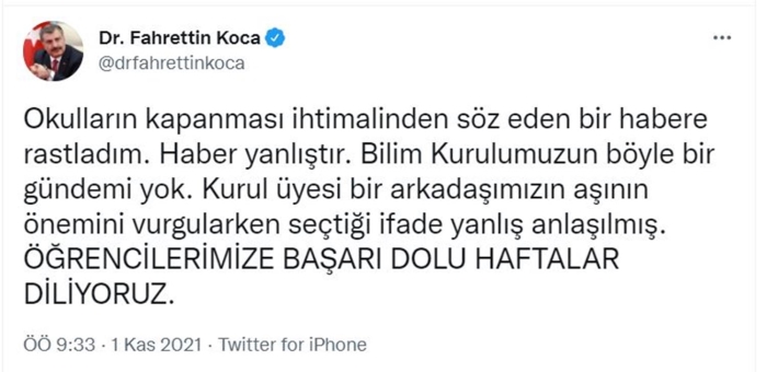 Bakan Koca, Twitter hesabından yaptığı açıklamada, "Okulların kapanması ihtimalinden söz eden bir habere rastladım. Haber yanlıştır. Bilim Kurulumuzun böyle bir gündemi yok. Kurul üyesi bir arkadaşımızın aşının önemini vurgularken seçtiği ifade yanlış anlaşılmış. Öğrencilerimize başarı dolu haftalar diliyoruz" ifadelerini kullandı.