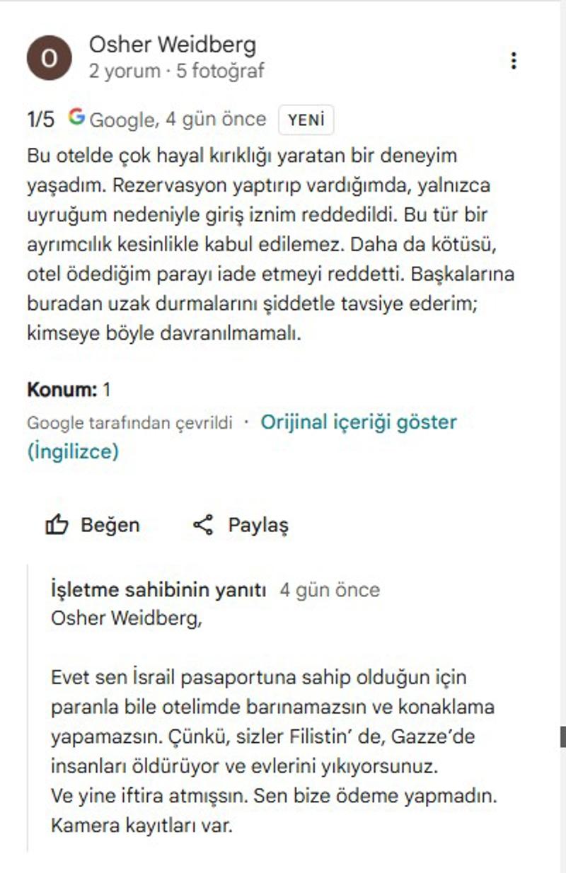 Olay, İsraillinin otelin hesabının altına, "Osher Weidberg" ismiyle yaptığı paylaşımla ortaya çıktı. İşgalci yaptığı paylaşımda, "ücretini ödemesine rağmen ayrımcılığa uğradığını ve otele alınmadığını" öne sürdü.