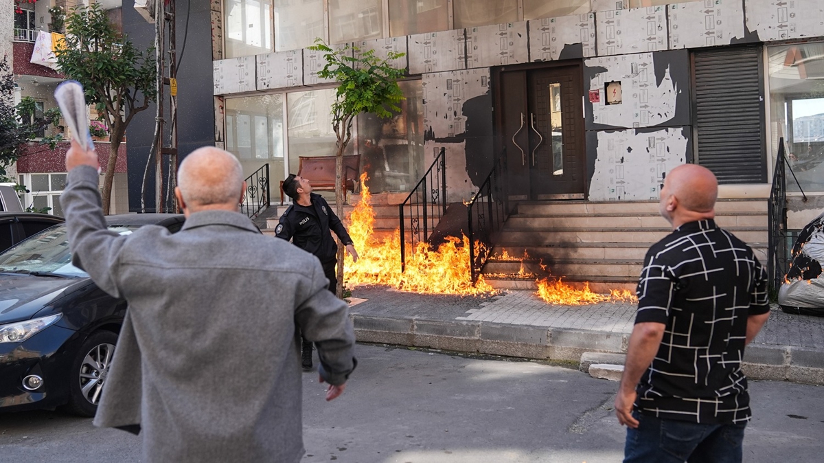 Ekiplere kapıyı açmayan bu kişi binanın çatı katına çıkarak dış cephe kısmını ateşe verdi.