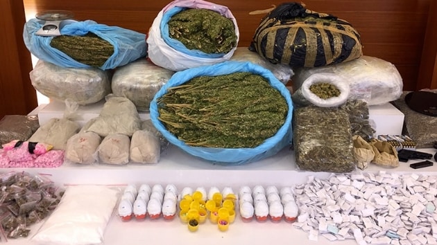 Adreslerde yapılan aramalarda, 43 kilogram Hint Keneviri, 5 kilo 350 gram eroin, 7 kilo 834 gram bonzai, 1 kilo 350 gram esrar, 5 bin 390 uyuşturucu hap, 17 litre aseton, 600 gram bonzai yapımında kullanılan kimyasal hammadde, 2 hassas terazi, 2 tabanca, 2 şarjör ve 61 mermi ele geçirildi.