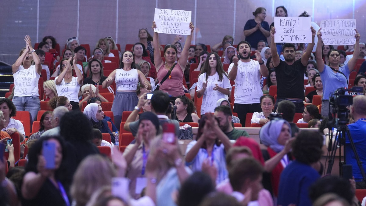 Özel, hakkını arayan işçilerin protestosuna tepki göstererek "Kadın kolları kongresini başka işlere alet etmeyin. Burada uzunca bir emeğin karşılığını almak için kadın örgütü varken onların sesine başka bir ses karıştırmak doğru değil. Burayı kadınlara bırakacaksınız. Bula bula bu örgütün toplantısını mı buldunuz provoke etmek için?" dedi.