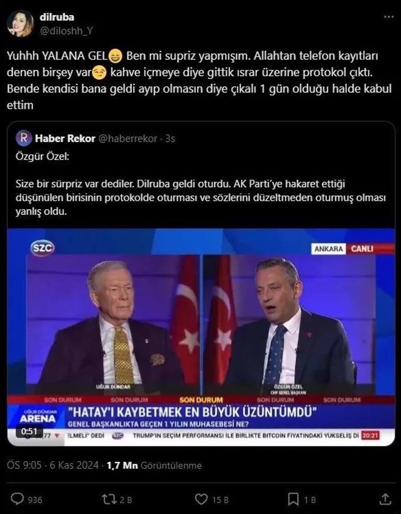 Özgür Özel'in açıklamalarına sosyal medyadan cevap veren Dilruba Kayserilioğlu, zehir zemberek ifadeler kullandı: Yuhhh Yalana Gel. Ben mi sürpriz yapmışım. Allah'tan telefon kayıtları denen bir şey var. Kahve içmeye diye gittik ısrar üzerine protokol çıktı. Ben de kendisi bana geldi ayıp olmasın diye çıkalı 1 gün olduğu halde kabul ettim.