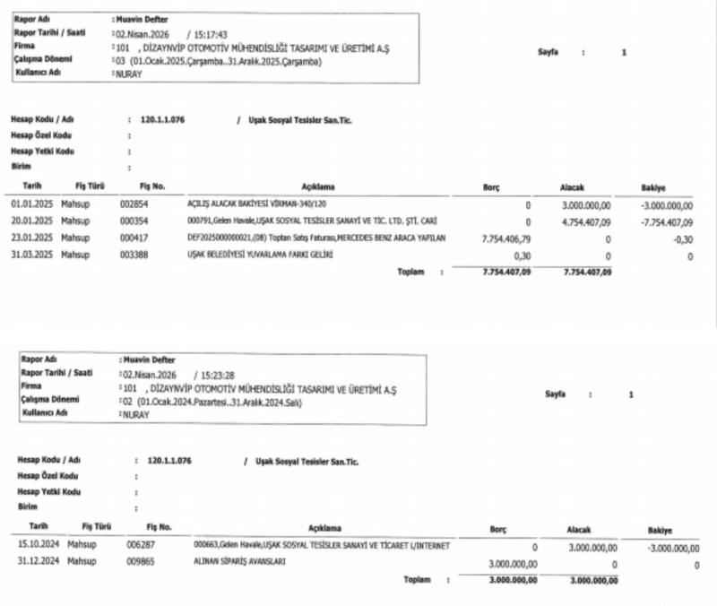 Dosyaya giren ifadeye göre DizaynVIP firması tarafından Uşak Belediyesi Sosyal Tesisleri adına iki ayrı Mercedes V300 araç için 898 bin TL ve 6 milyon 856 bin TL olmak üzere toplamda 7 milyon 754 bin TL'yi bulan iki ayrı fatura kesildi. Ardından bu iki fatura tek kalemde birleştirilip toplam 7 milyon 754 bin TL'lik tek bir fatura düzenlendi.