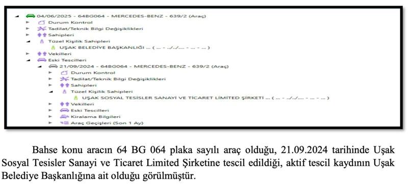 İkinci araçla ilgili yapılan sorgulamalarda sistem "yetki yok" uyarısı verdi. Ancak Mali Suçlarla Mücadele birimleri üzerinden yapılan incelemede gizlenen kayıt açıldı ve aracın CHP Genel Başkanı Özgür Özel adına kayıtlı olduğu kesinleşti. Bu bulgu, "Uşak Belediyesi kasasından çıkan parayla Özgür Özel'in aracına VIP dönüşüm yapıldığı" iddiasını doğrudan soruşturma evrakına giren somut tespitler arasına taşıdı.