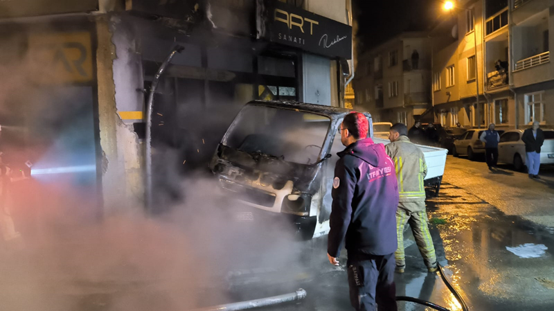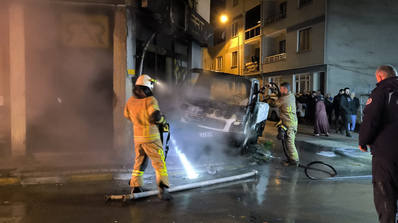 Orhaniye Mahallesi Caner Sokak'ta park halindeki 59 ACD 356 plakalı kamyonet, henüz bilinmeyen bir nedenden alev aldı.