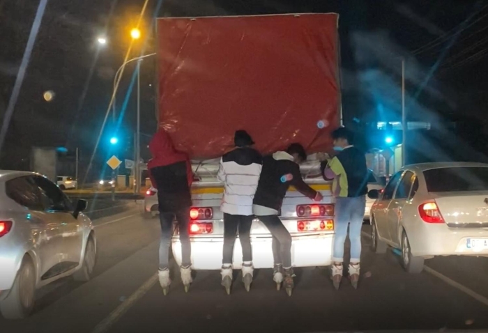 Sürücülerden bazıları, tehlikeli yolculuğu cep telefonu kamerasıyla görüntülerken, bazıları da şaşkınlıkla gençleri izledi. Patenli gençler, kamyonetin kavşaktan yan yola girmesiyle gözden kayboldu.
