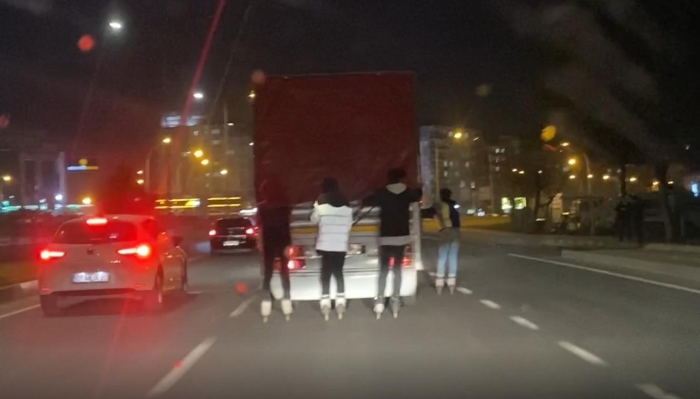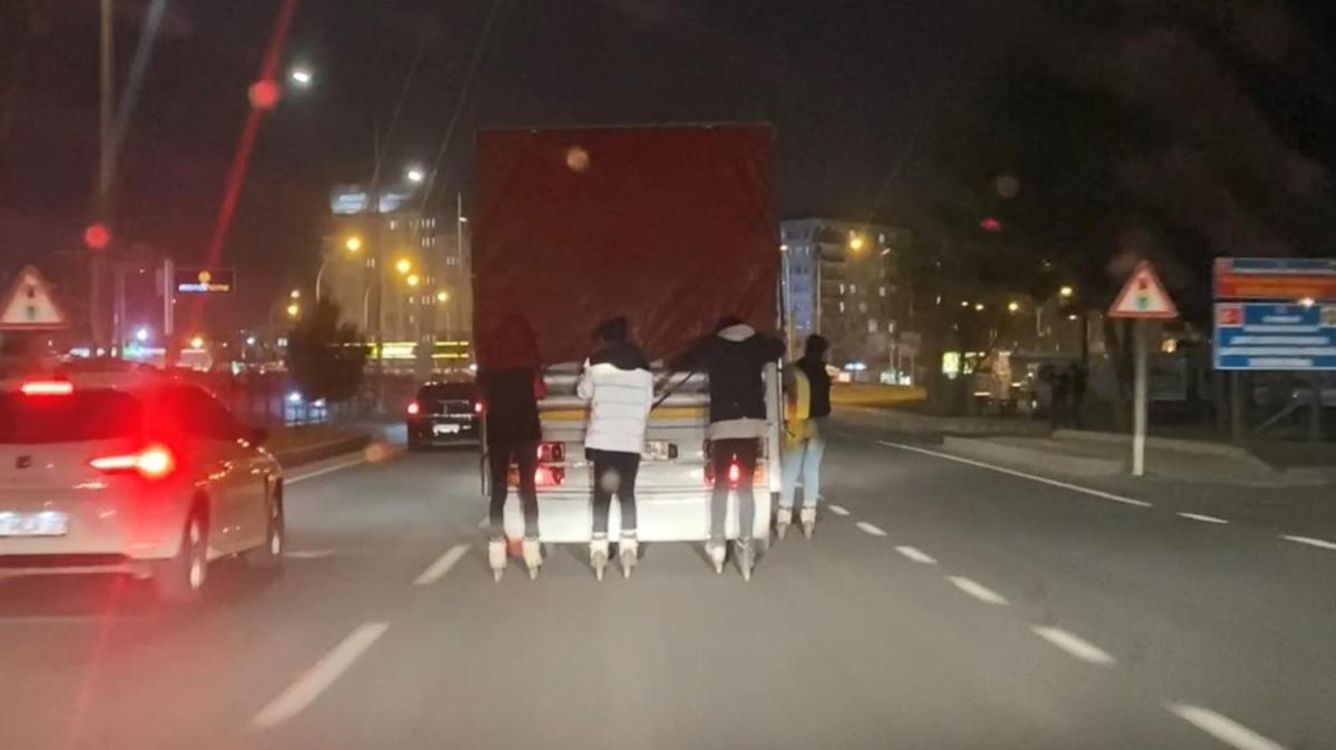 Sürücülerden bazıları, tehlikeli yolculuğu cep telefonu kamerasıyla görüntülerken, bazıları da şaşkınlıkla gençleri izledi. Patenli gençler, kamyonetin kavşaktan yan yola girmesiyle gözden kayboldu.