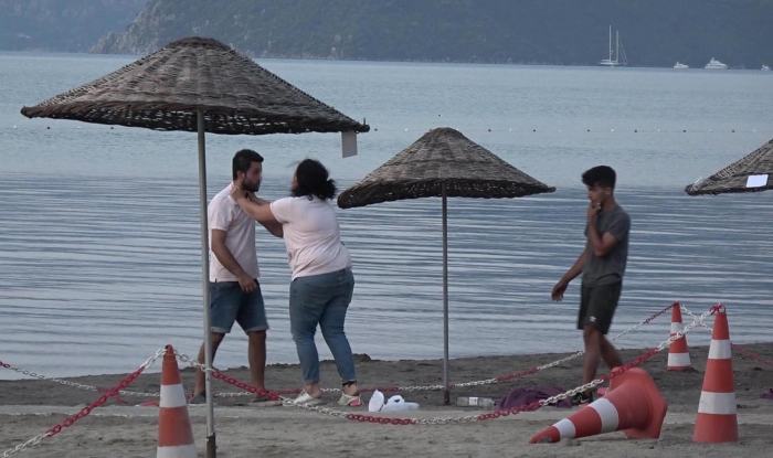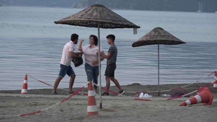 Atatürk Caddesi'ndeki Halk Plajı'nda bugün saat 06.00 sıralarında, birlikte oturan 2'si kadın 4 arkadaştan kadın, karşısındaki erkeğe, "İçeceksen adam gibi iç" diye bağırdı. Bunun üzerine ikili arasında tartışma çıktı. Birbirlerine küfredip, hakaretler yağdıran tarafları arkadaşları sakinleştirmek istedi. Ancak, 'Defol git' diye bağıran kadın, üzerine yürüyen erkeğe tokat ve yumruk atıp, tekmeyle karşılık verdi. Neye uğradığını şaşıran erkek ise sinirini çevredeki hasır şemsiyeler ve plastik dubalara vurup, hasar vererek çıkardı. Çevredekilerin ihbarı üzerine olay yerine polis ekipleri sevk edildi. Bu arada çıktıkları sahil yolunda da kavga etmeyi sürdüren taraflar polislerin geldiğini fark edince, çöplerini sahilde bırakıp, sanki hiçbir şey olmamış gibi yaya olarak uzaklaştı.