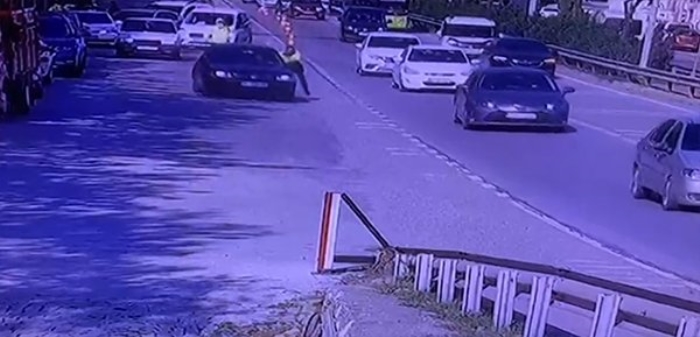 Bu sırada araç sürücüsü Bülent Sadıkoğlu aracı hareket ettirerek polis Memuru Bedir Yıldız'ı 30 metre sürükledi. Ölümden dönen polis memuru, sürüklendikten sonra yere düşerek yaralandı.