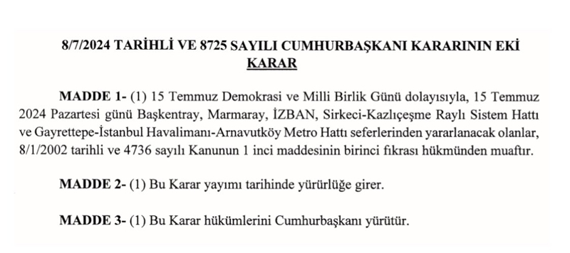 Resmi Gazete'de 9 Temmuz'da ilan edilen Cumhurbaşkanlığı kararına göre 15 Temmuz günü Marmaray, Başkentray, İstanbul Havalimanı ve bazı hatlar ücretsiz olacak.