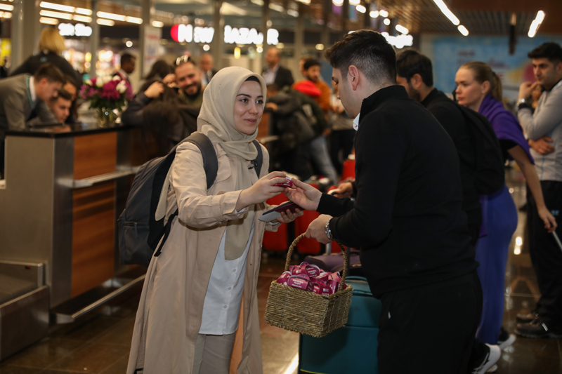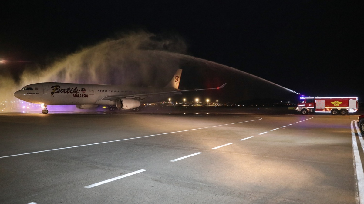 Malezya'dan gelen Batik Air uçağı, geleneksel su takı töreniyle karşılanırken, yolculara da terminalde çiçek verildi ve lokum ikram edildi.