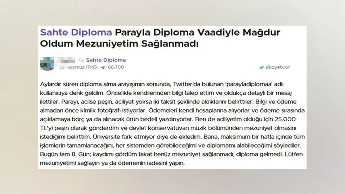 Kimi işinden olmamak için kimi tıp mezunu olmak istediği için kimi de hırsları yüzünden okumadıkları okuldan 'sahte diploma' çıkarmak için sosyal medya ve internet siteleri üzerinden kimliği belirsiz şahıslarla anlaştı. Vatandaşlar belli bir ücret karşılığında anlaştı. Anlaştıkları rakamın bir kısmını hazırlık sürecinde bir kısmını da sahte diploma teslim edildikten sonra yatıran vatandaşlar; bir süre sonra kendilerine muhatap bulamadı. Hem paralarından olan hem de çıkarmak istedikleri sahte diplomaları teslim alamayan kişiler ise bu sefer çareyi 'müşteri memnuniyet' platformu olan 'ŞikayetVar'a yazmaya başladı.