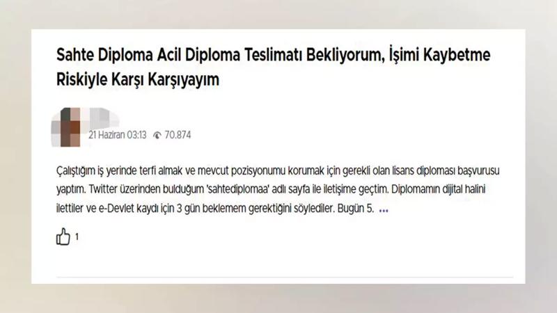 Bir başka kullanıcı da lisans diploması için 25 bin TL'ye anlaştığını, paranın yarısını yatırdığını daha sonra ise geri kalan kısmını gönderdiğini belirtti. e-devlette görüneceği iddia edilen diplomayı alamayan kullanıcı, "Görüntülü görüşme kayıtları, para gönderdiğime dair dekontlar ve gönderdiğim kişilerin adresleri elimde mevcut. Temmuz ayının sonuna kadar diplomam gelmez ve e devlet'te görünmezse olacaklardan ben mesul değilim. Bakın bakalım sizlere nasıl ulaşıyorum" diye yazdı.