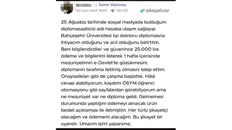 Bir diğer kullanıcı ise; "Tıp lisans diploması için 'sahte diplomacıya' başvurduğunu platforma yazdı. Diplomasını almak için 25 binTL'ye anlaştıklarını söyleyen vatandaş, ödemesini yaptığını fakat diplomasının gelmediğini söylüyor. Yazısının sonunda ise 'her türlü şikayetçi olacağını' belirtiyor.