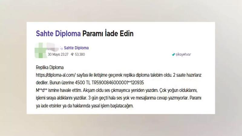 Siteye şikayette bulunan başka bir vatandaş ise, "https://diploma-al.com/ sayfası ile iletişime geçerek replika diploma talebim oldu. 2 saate hazırlarız dediler. Bunun üzerine 4 bin 500 TL M**d** ismine havale ettim. Akşam oldu ses çıkmayınca yeniden yazdım. Çok yoğun olduklarını, işlemi sıraya aldıklarını yazdılar. 3 gün geçti hala ses yok ve mesajlarıma cevap yazmıyorlar. Paramı ya iade etsinler ya da haklarında yasal işlem başlatacağım" ifadelerini kullandı.