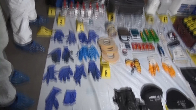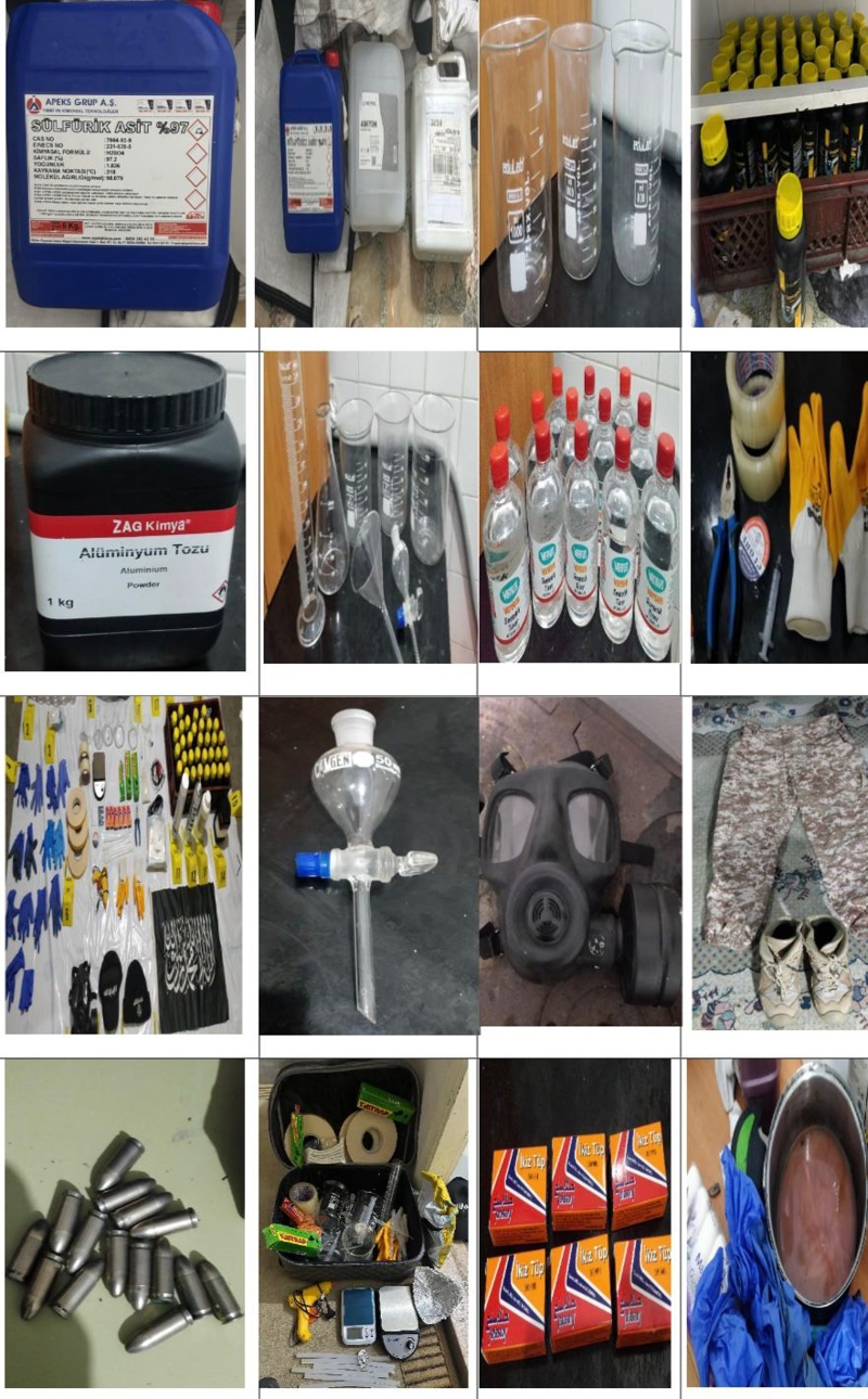 Yapılan aramalarda yüksek hassas patlayıcılardan TATP, çok miktarda bomba yapımında kullanılan kimyasal madde, laboratuvar ve kamuflaj malzemeleri, laboratuvar giysileri ve maskeleri, terör örgütü DEAŞ'ın sözde flamaları, çeşitli yasaklı yayınlarla dijital materyal ele geçirildi.
