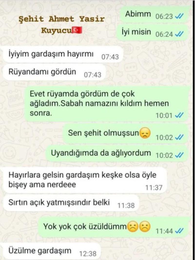 Kuyucu'nun, kendisinin şehit olduğunu rüyasında gördüğünü telefonda mesajla ileten kardeşine "Hayırlara gelsin kardeşim, keşke olsa öyle bir şey ama nerede." diye karşılık verdiği görüldü.
