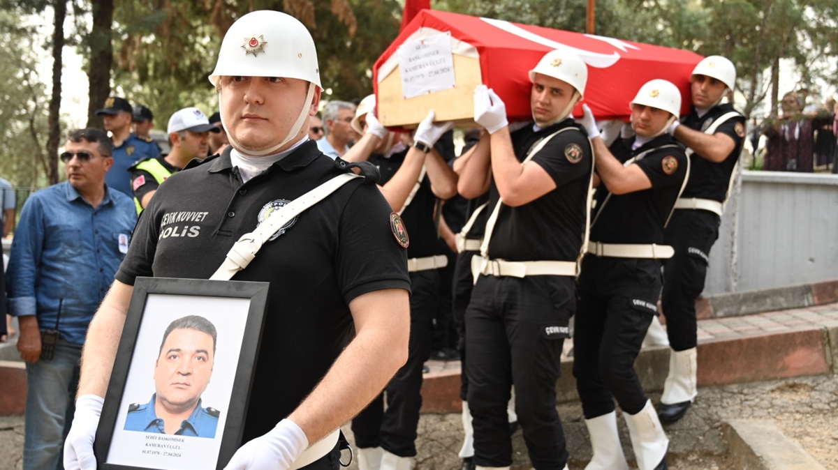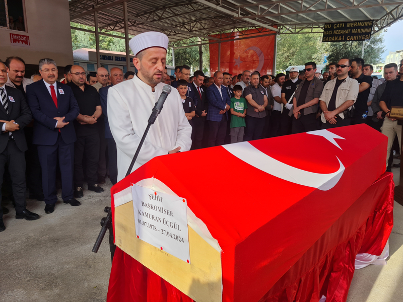 Polis Merkezi Amiri Üçgül'ün (46) naaşı, Cemalpaşa Mahallesi'ndeki babaevinin önünde helallik alınmasının ardından cenaze töreni için Kadirli Asri Mezarlığı'na götürüldü.