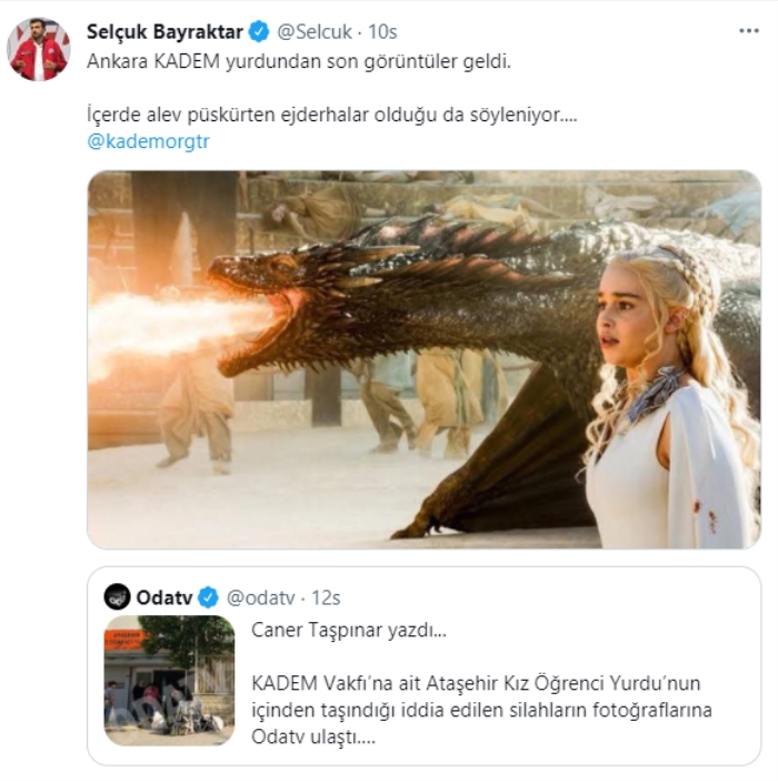 Twitter hesabından açıklama yapan BAYKAR Teknoloji Lideri Selçuk Bayraktar ise Odatv'nin söz konusu yalan haberini "Ankara KADEM yurdundan son görüntüler geldi. İçerde alev püskürten ejderhalar olduğu da söyleniyor..." sözleriyle ti'ye aldı.