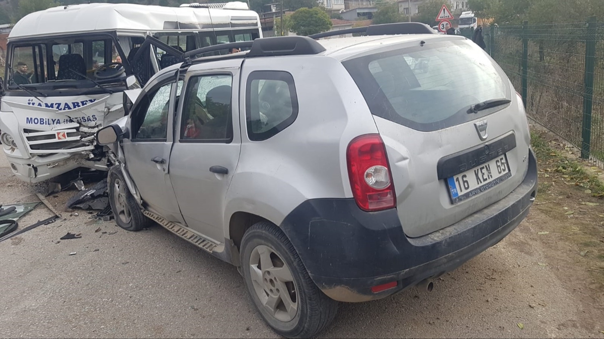 İlçe merkezi ile kırsal Hamzabey Mahallesi arasındaki yolda karşı yönlerden gelen Mehmet Furkan D'nin (23) kullandığı 16 KEN 65 plakalı SUV tipi otomobil ile Mehmet Necati K. (67) idaresindeki 16 ACB 917 plakalı servis minibüsü çarpıştı.