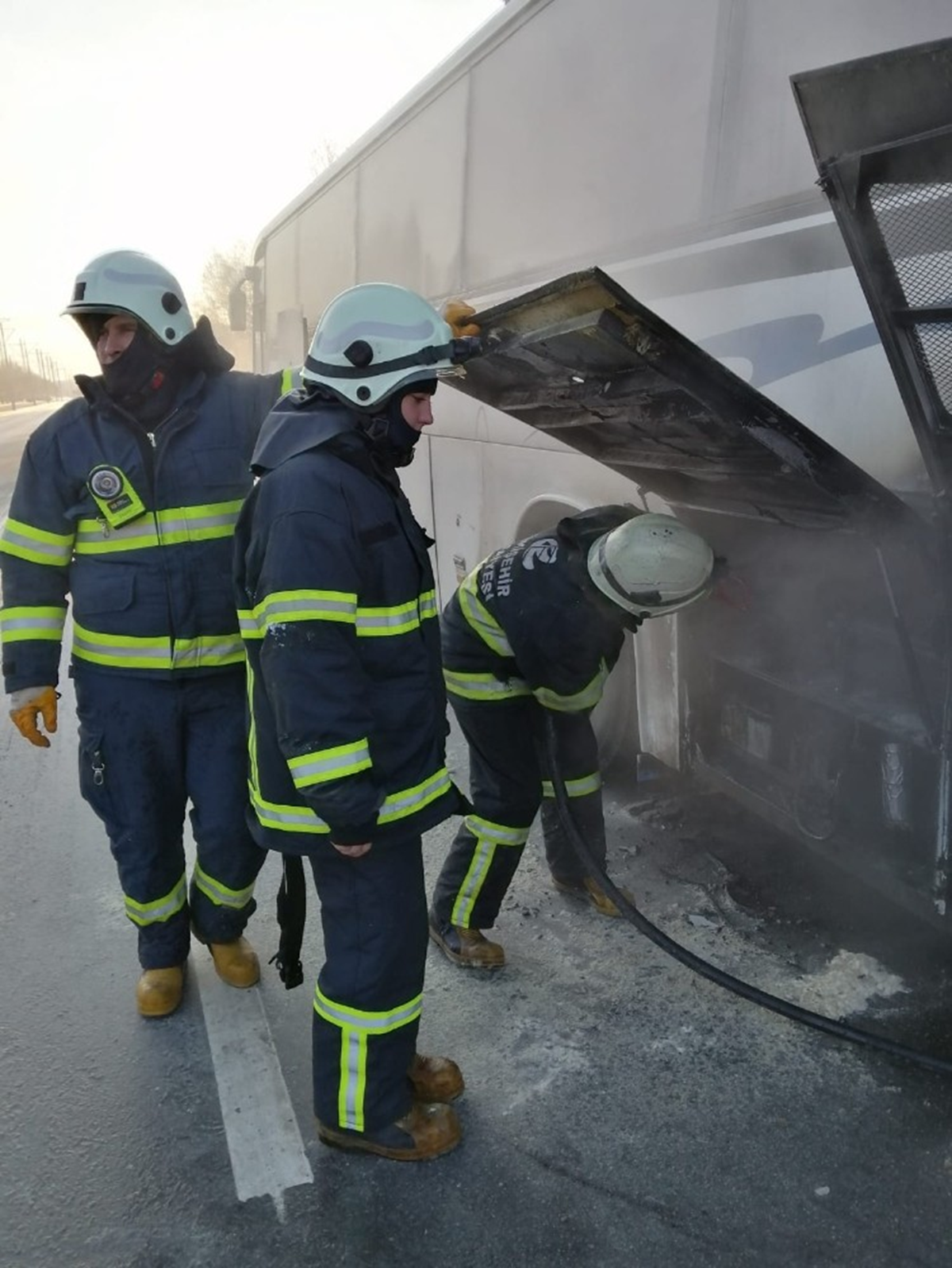 Bu esnada alevler otobüsün arka bölümünü sararken, itfaiye ekipleri de iki koldan söndürme çalışmasını aralıksız sürdürdü. Yaklaşık 1,5 ton su kullanılarak söndürülen otobüste yaklaşık 10 bin TL’lik zarar meydana geldi.