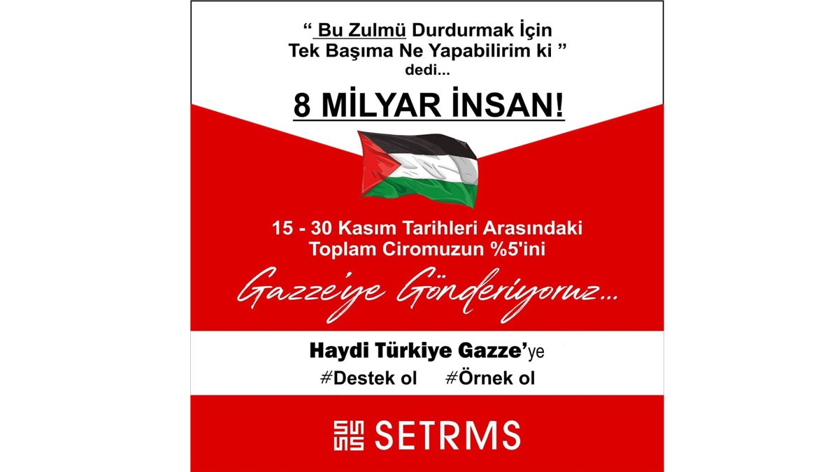 Setrms, 15 Kasım-30 Kasım tarihleri arasında gerçekleştireceği cironun yüzde 5'ini resmi ve kamu yararına çalışan insani yardım kuruluşları aracılığıyla Gazze halkına ulaştırma kararı aldı. Bağışlanacak rakam ile Gazze halkının sağlık, beslenme ve barınma başta olmak üzere insani temel ihtiyaçları karşılanacak. Söz konusu tarihler aralığında gerçekleştirilen ciro yüzdesi, 1 Aralık'ta bağımsız denetim kuruluşları tarafından yapılacak denetimle tespit edilecek ve bağış, yapılan bu denetime istinaden gerçekleştirilecek.