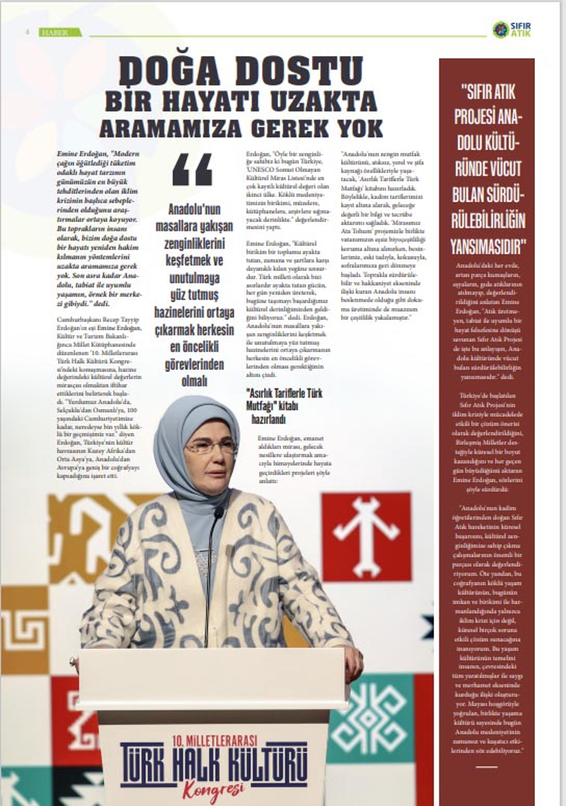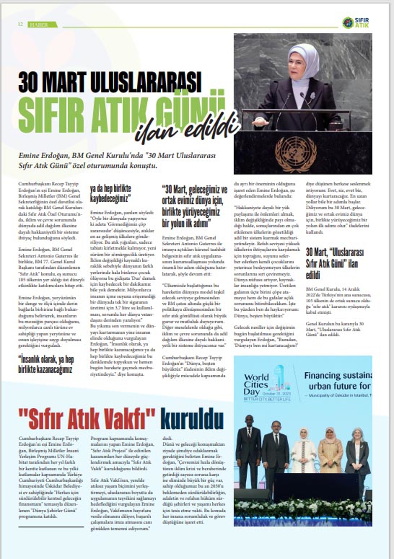 "Saygıdeğer Emine Erdoğan Hanımefendi'nin öncülüğünde 2017'de başlatılan Sıfır Atık Hareketinin çalışmalarını konu alan Sıfır Atık gazetemizin yeni sayısı bugün yayınlandı. Hem matbu olarak hem de dijitalde dolu dolu içeriklerle yayınlanan gazetemiz okuyucularıyla buluştu. Bu vesileyle Sıfır Atık'ın bir dünya markası haline gelmesine öncülük eden Emine Erdoğan Hanımefendi'ye şükranlarımı sunuyorum. Cumhurbaşkanımız Recep Tayyip Erdoğan'ın liderliğinde Türkiye Yüzyılı'na uygun olarak daha temiz ve daha yeşil bir dünya için Sıfır Atık başta olmak üzere pek çok projemizi hayata geçirmeye devam edeceğiz."