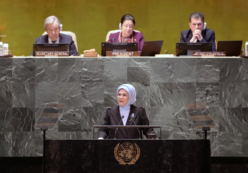 BM'nin New York'taki Genel Kurul Salonu'nda 30 Mart 2023'te ilk kez kutlanan "Uluslararası Sıfır Atık Günü"ne BM Genel Sekreteri'nin özel davetlisi olarak katılan Emine Erdoğan, BM Genel Kurulu'nda bir konuşma gerçekleştirdi.