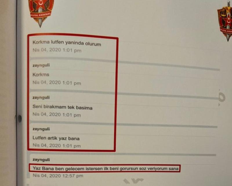 Ulusal Kriminal Büro raporlarında, Gülistan'a gönderilen mesajlardaki ifadeler gündem oldu. İncelemelerde, şüpheli Zaynal Abakarov'un mesajlarında sürekli tekrar eden "ONLAR" vurgusu dikkat çekti.
