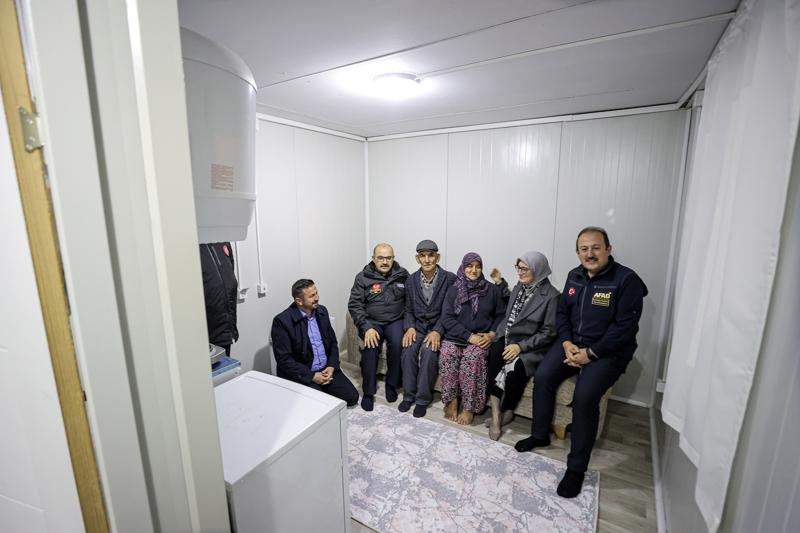 "Dün akşama doğru alanı seçtik ve altyapısıyla kanalizasyonu, içme suyu, elektriği ve parke taşına kadar döşemek suretiyle burada konteynerlerimizi konuşlandırmaya başladık. İlk etapta 100 konteyner getirdik ama ihtiyaç nispetinde dün 50 konteyner daha hazır ettik. İçinde belli yaşam malzemeleri olan, klimasından termosifonuna kadar donatılmış ve yaz-kış, sıcak-soğuk duyarlılığı olan son derece münasip, yaşama uygun 'yaşam konteyneri' zaten adından da anlaşılacağı üzere... Bu saat itibarıyla ailelerimize konteynerlerimizin anahtarlarını teslim ediyoruz ve burada barınmaya başlayabilecekler."