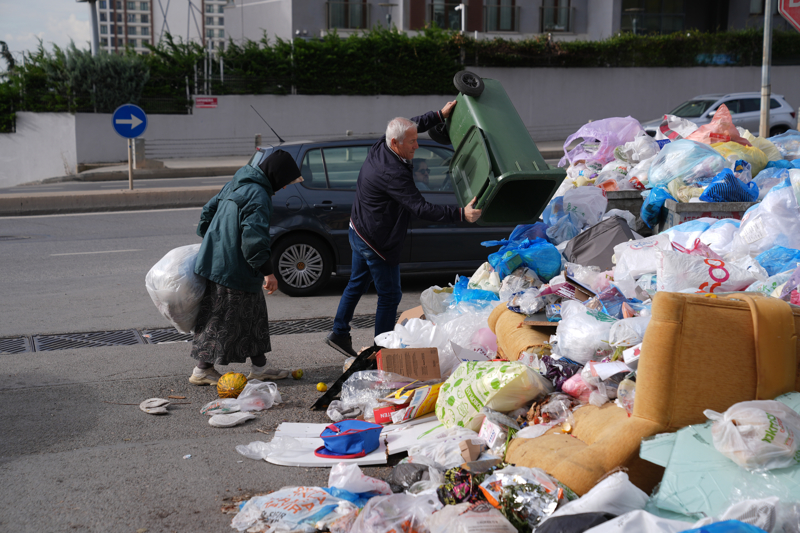 Geri dönüşüm için atık toplayanların konteynerde biriken çöp yığınlarının üzerine çıkarak, bu atıkları ayıklamak zorunda kaldığı gözlendi.
