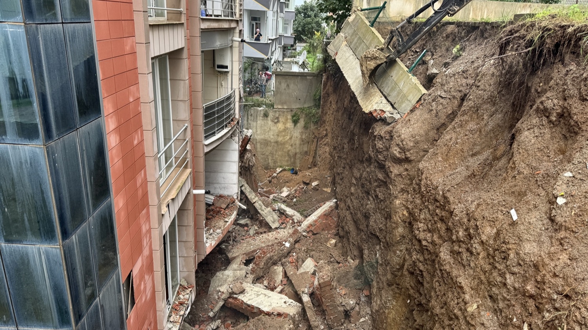 Kepçe ile yapılan çalışma sırasında duvarın ayakta kalan bölümü 7 katlı binanın arka cephesinin üzerine devrilerek zarar verdi.
