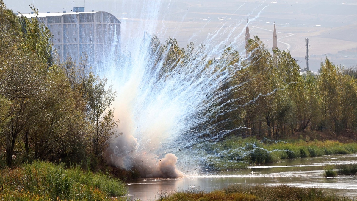 Sivas'ta balık tutmak için Kızılırmak kenarına gelen bir vatandaşın bulduğu top mermisi kontrollü şekilde imha edildi.