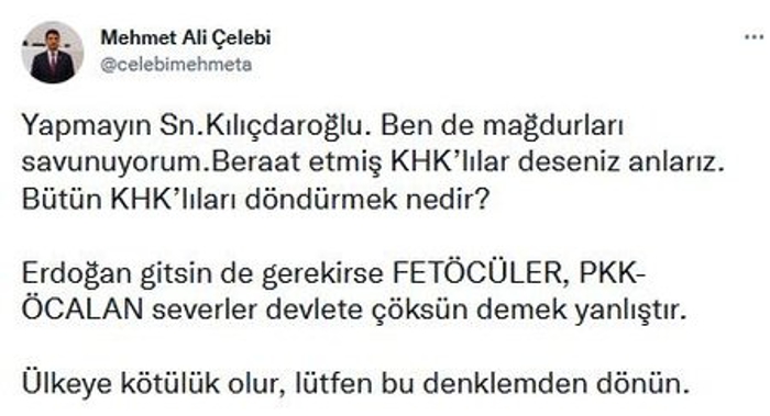 Kemal Kılıçdaroğlu'nun açıklamasına ise CHP'den istifa eden Bağımsız vekil Mehmet Ali Çelebi çok sert tepki gösterdi. Mehmet Ali Çelebi, "Yapmayın Sn.Kılıçdaroğlu. Ben de mağdurları savunuyorum.Beraat etmiş KHK'lılar deseniz anlarız. Bütün KHK'lıları döndürmek nedir? Erdoğan gitsin de gerekirse FETÖCÜLER, PKK-ÖCALAN severler devlete çöksün demek yanlıştır. Ülkeye kötülük olur, lütfen bu denklemden dönün." dedi.