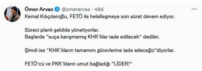 AK Parti Tanıtım ve Medya Başkan Yardımcısı Ömer Arvas da, "Kemal Kılıçdaroğlu, FETÖ ile helalleşmeye son sürat devam ediyor. Süreci planlı şekilde yönetiyorlar. Başlarda "suça karışmamış KHK'lılar iade edilecek" dediler. Şimdi ise "KHK'lıların tamamını görevlerine iade edeceğiz"diyorlar. FETÖ'cü ve PKK'lıların umut bağladığı "LİDER!"" sözleriyle Kılıçdaroğlu'nun açıklamalarına tepki gösterdi.