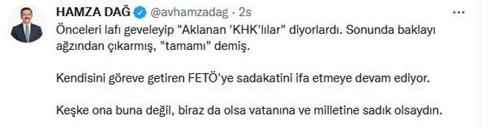 AK Parti Genel Başkan Yardımcısı Hamza Dağ sosyal medya hesabından yaptığı paylaşımla Kılıçdaroğlu'nun skandal ifadelerine sert tepki gösterdi. Hamza Dağ paylaşımında, "Önceleri lafı geveleyip 'Aklanan 'KHK'lılar' diyorlardı. Sonunda baklayı ağzından çıkarmış, 'tamamı' demiş. Kendisini göreve getiren FETÖ'ye sadakatini ifa etmeye devam ediyor. Keşke ona buna değil, biraz da olsa vatanına ve milletine sadık olsaydın" dedi.