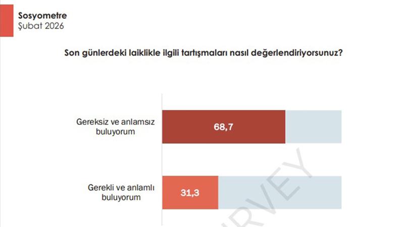 Areda Survey'in her ay yaptığı gündemdeki konularla ilgili kamuoyu araştırmasının şubat ayı verileri yayınlandı. 7 Şubat-3 Mart 2026 tarihleri arasında 3 bin 63 kişi ile yapılan araştırmaya göre, Milli Eğitim Bakanlığı'nın okullardaki Ramazan etkinliklerini hedef alan bazı çevrelerin "laiklik elden gidiyor" söylemi toplumda karşılık bulmadı. Araştırmaya göre katılımcıların yüzde 68.7'si "laiklik tartışmalarını gereksiz ve anlamsız bulduğunu" söyledi. Ankete katılanların yüzde 60.7'si ise Türkiye'de laikliğin tehlike altında olmadığı görüşünde.