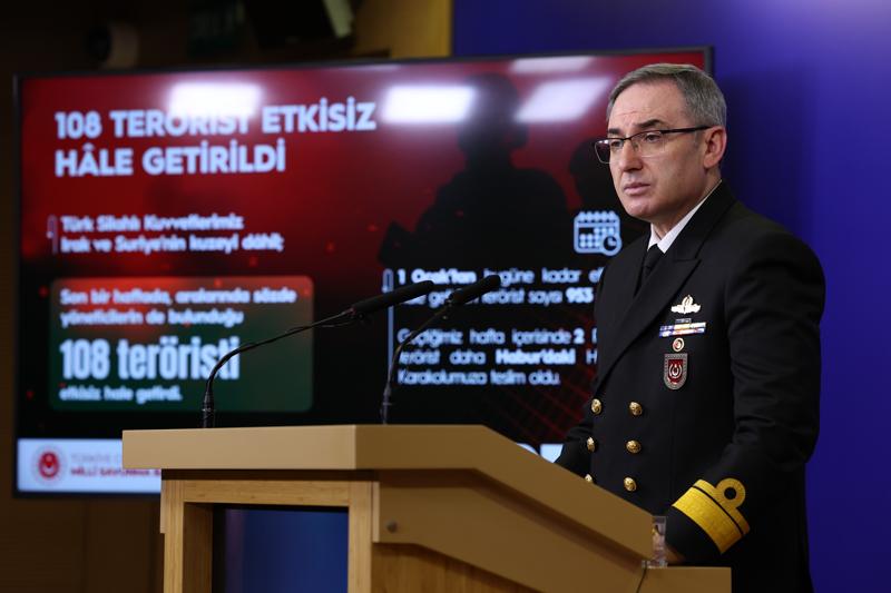 Tuğamiral Aktürk, Türk Silahlı Kuvvetlerimiz, Irak ve Suriye'nin kuzeyi dahil, son bir haftada, aralarında sözde yöneticilerin de bulunduğu 67'si Irak'ın, 41'i ise Suriye'nin kuzeyinde olmak üzere 108 teröristi etkisiz hale getirdiğini belirterek, "1 Ocak 2024'ten bugüne kadar etkisiz hale getirilen terörist sayısı 443'ü Irak'ın kuzeyinde, 510'u ise Suriye'nin kuzeyinde olmak üzere 953'e ulaştı." diye konuştu.