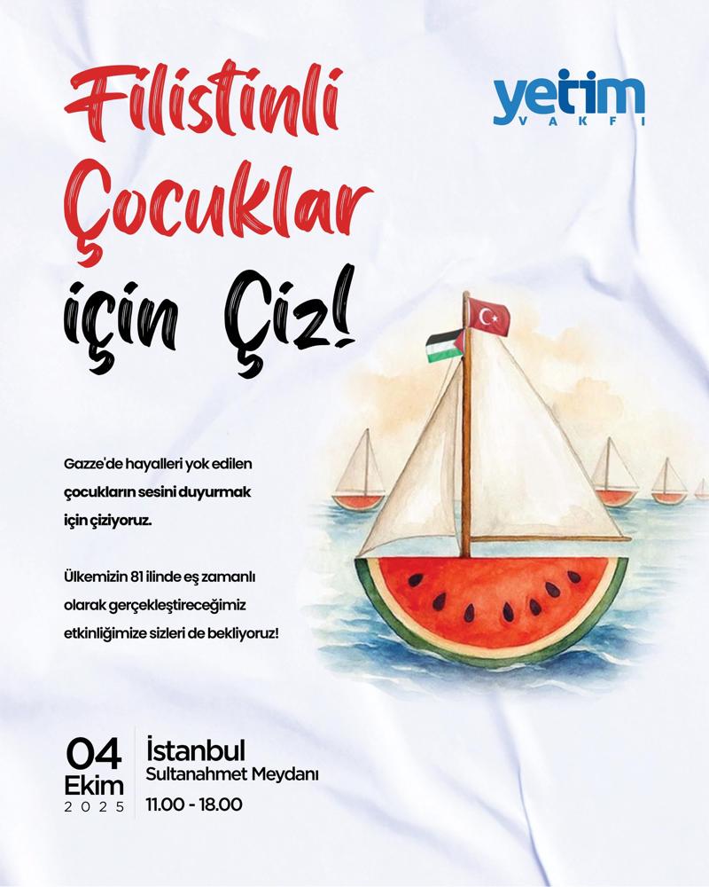 Gazze'deki çocukların umuduna ortak olmak isteyen Yetim Vakfı, "Filistinli Çocuklar İçin Çiz" sloganıyla İstanbul'da düzenlenecek etkinliğin Sultanahmet Meydanı'nda yapılacağını bildirdi.
