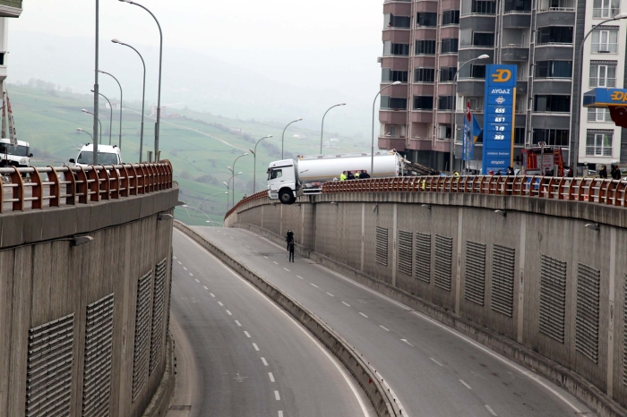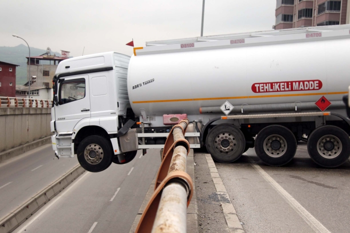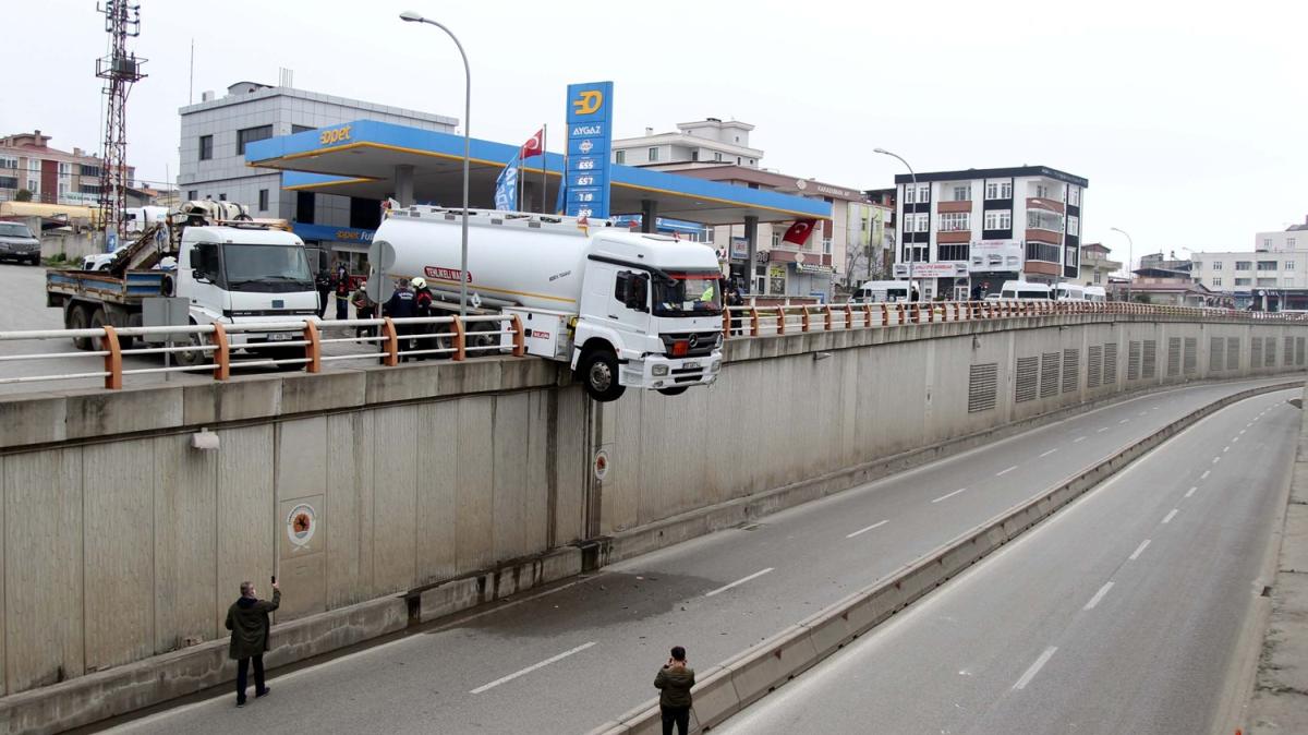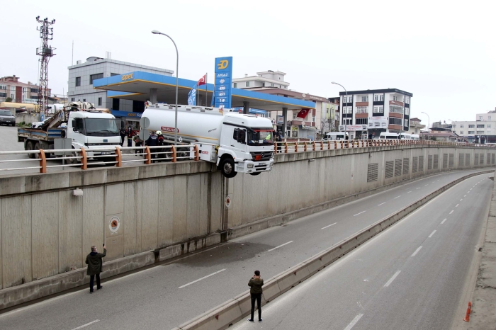 Turgut'un el frenini indirmeden çalışır vaziyette bıraktığı tanker, hareket ederek Şehit Korhan Ekiz Bulvarı'nda bulunan viyadükte korkuluğu kırarak asılı kaldı.