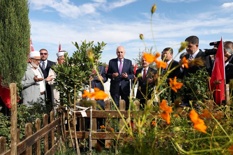 Mezarlara karanfil bırakan Kurtulmuş, okunan Kur'an-ı Kerim'in ardından yapılan duaya eşlik etti.