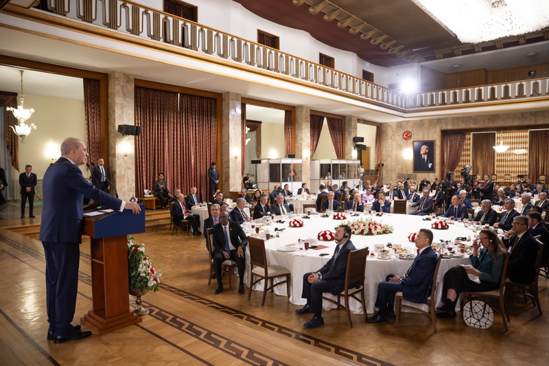 "Ümit ediyoruz, öyle olmasını temenni ediyoruz ki inşallah yer yüzünde yeni bir dünyanın kurulması, hakkaniyetin, adaletin tesis edilmesi mümkün olur. Bunun için uluslararası camianın mensupları olarak hep birlikte hareket etmek ve ortak kararlar almak mecburiyetindeyiz. Türkiye'deki dostlarımız olarak, burada faaliyet gösteren büyükelçileri, siz değerli dostlarımızı, uluslararası kuruluşların temsilcilerini, Türkiye'nin dış politika vizyonunda tabii ortaklarımız, tabii fikir alışverişinde bulunacağımız dostlarımız olarak telakki ediyoruz. Burada gelişecek, Türkiye'nin de içinde bulunduğu yeni bir dünya arayışının kendi ülkeleriniz ve hükümetleriniz nezdinde de dile getirilmesi için sizlerden insanlık adına, insanlık cephesine destek olmanızı bekliyoruz."